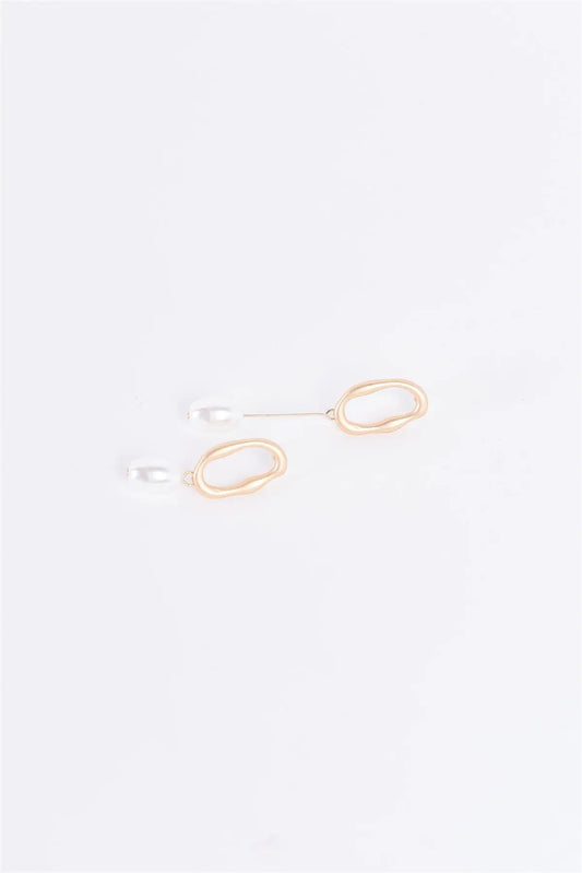 Matte Gold Oval Asymmetrical Pearl Drop Earrings